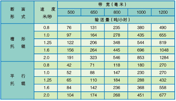 表中輸送量是物料堆積比重V=1t/m3.輸送傾角0—7。,物料在帶上是堆積角為30。的條件下計(jì)算的。
